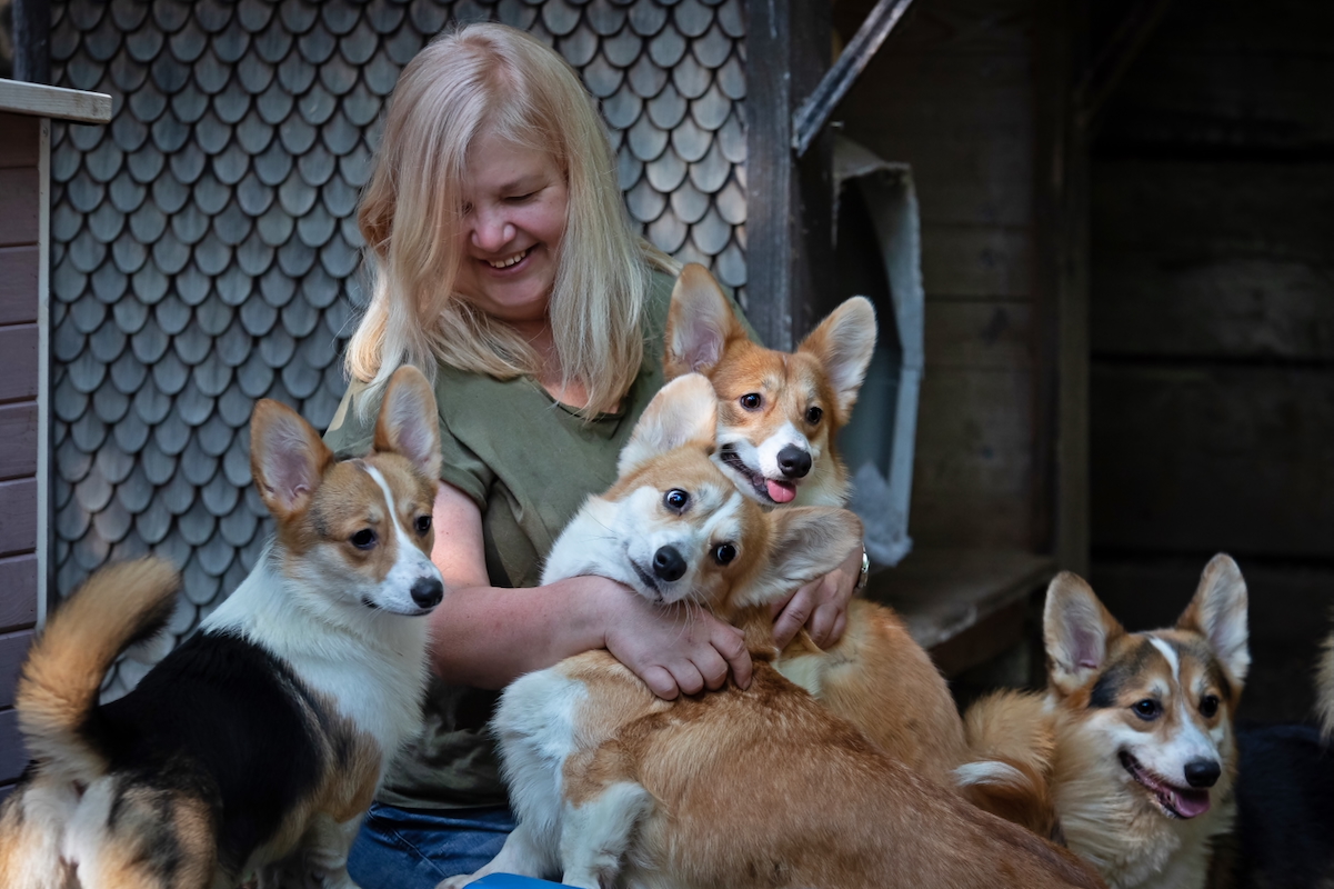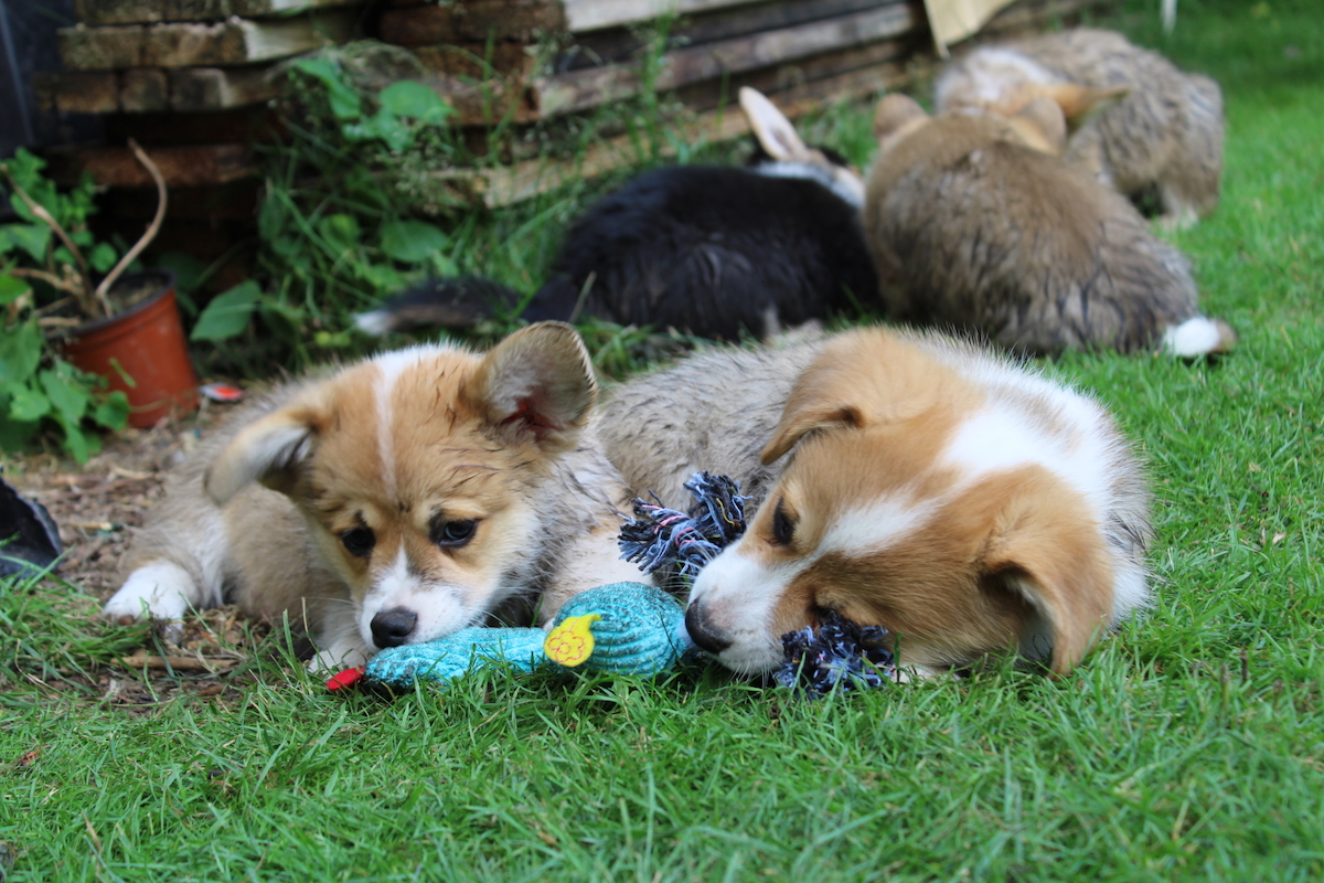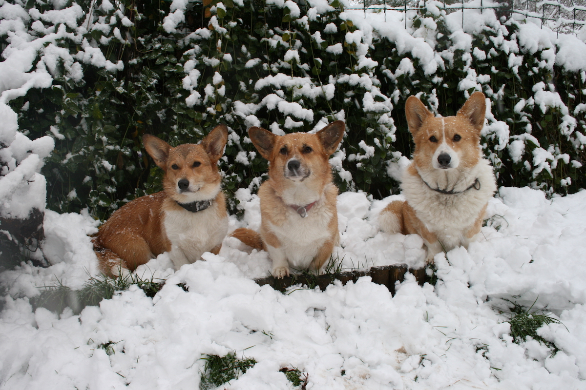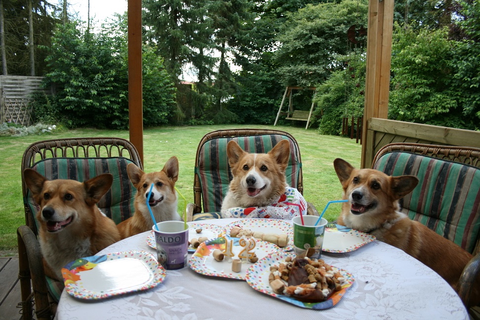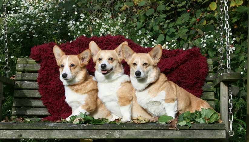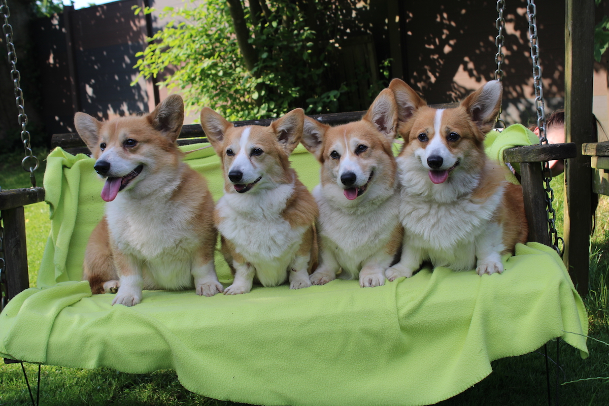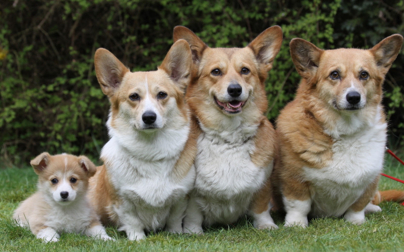 10 Jahre Quo Vadis Corgis, 5 Generationen, links Ch. Quo Vadis Annale, Ch. Quo Vadis Conni (Chrissy), Ch. Gretchen, Jamaika, Olivia